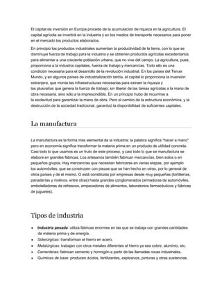 La industria transforma las materias primas en productos elaborados mediante procesos y maquinaria. Existen diferentes tipos de industrias según los productos que fabrican, como la alimenticia. La revolución industrial en el siglo XVIII aumentó enormemente la producción industrial gracias a nuevos métodos. Históricamente, la industria ha sido el motor económico hasta la Segunda Guerra Mundial aunque ahora ha pasado a un segundo plano. La manufactura es la forma más básica de industria que transforma manualmente las materias primas.