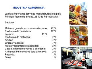 El documento compara el gasto y dieta de una familia alemana versus una familia de Chad. La familia alemana gasta $500 por semana en una dieta equilibrada, mientras que la familia de Chad solo gasta $1.62 por semana y no cubre sus necesidades nutricionales básicas. Además, describe brevemente la industria alimenticia como la actividad manufacturera más importante en el país.