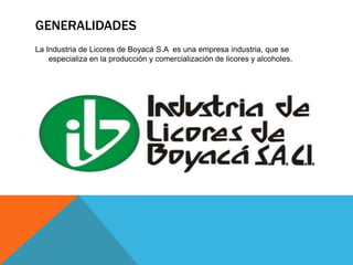 La Industria de Licores de Boyacá S.A es una empresa que se especializa en la producción y comercialización de licores en Boyacá, Colombia. Fue fundada en 1924 y ha operado desde varias sedes a lo largo de su historia, actualmente opera con 30 empleados. La empresa transfiere más de $15.000 millones anuales en impuestos y utilidades al departamento de Boyacá.