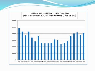 El documento presenta un análisis del sector farmacéutico en Perú desde 1991 a 2011, destacando el crecimiento y la importancia del control de calidad en los medicamentos. Se discuten las importaciones y exportaciones, así como los desafíos del mercado, incluyendo la necesidad de establecer confianza en los medicamentos genéricos. También se enfatiza en la importancia de implementar políticas claras para mejorar la situación de la industria farmacéutica nacional.