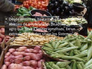 El documento describe la evolución de la agricultura automatizada en Chile desde las primeras incursiones en los años 80 usando computadoras de tarjetas perforadas hasta las aplicaciones más modernas como sistemas de información geográfica, software de gestión para productores, pronósticos de cosechas y control de plagas e irrigación. Actualmente la agricultura de alta tecnología usa satélites, sensores y bases de datos para lograr una producción más eficiente y reducir riesgos.