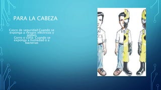 El documento describe los diferentes elementos de protección personal para la cabeza, ojos, oídos, aparato respiratorio, manos y pies. Menciona cascos, gafas, mascarillas, guantes y botas de seguridad que protegen contra impactos, productos químicos, polvo, ruido y otros riesgos industriales. También define la seguridad industrial como el sistema para prevenir riesgos y proteger la salud de los trabajadores a través del uso de equipos de protección personal adecuados.