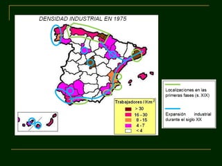 Este documento describe la evolución de la industria y la industrialización en España desde finales del siglo XIX hasta la actualidad. Se divide en tres etapas: 1) La aparición y expansión de la industrialización desde 1855 hasta 1959, 2) La crisis y reestructuración industrial desde 1975 a 1985, y 3) La situación actual de la industria española.