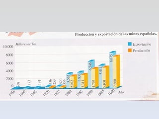 La industria textil se desarrolló rápidamente en Cataluña gracias a las medidas proteccionistas. A mediados de siglo había más de 1,500 fábricas de algodón. La minería también creció para exportar plomo, mercurio, hierro y cobre. El ferrocarril, impulsado por la ley de 1855, se expandió rápidamente pero con mala calidad y beneficiando capital extranjero. La economía española mantuvo estructuras arcaicas junto a focos industriales incipientes, quedando atras