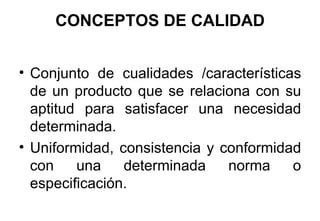 El documento trata sobre conceptos de calidad en la industria alimentaria como uniformidad, atributos organolépticos y percepción del consumidor, así como el control de calidad e higiene de los alimentos. Se describen las características físicas y ocultas de la calidad de los alimentos y los sistemas de calidad como BPM, POES, APPCC e ISO que buscan garantizar la inocuidad de los alimentos. Finalmente, se menciona al Codex Alimentarius como código alimentario internacional y a la normalización en el Perú.