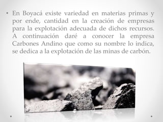Carbones Andinos es una empresa colombiana fundada en la década de 1950 en Boyacá dedicada a la extracción y producción de carbón y coque. La empresa inició operaciones en las minas de carbón de "Chorrera" y "Loma Redonda" en Samacá, estableciendo una relación comercial con Acerías Paz del Río. Actualmente es el cuarto productor de coque de alta calidad en Colombia con una capacidad de 150,000 toneladas por año. La misión de Carbones Andinos es explotar, producir y comercializar