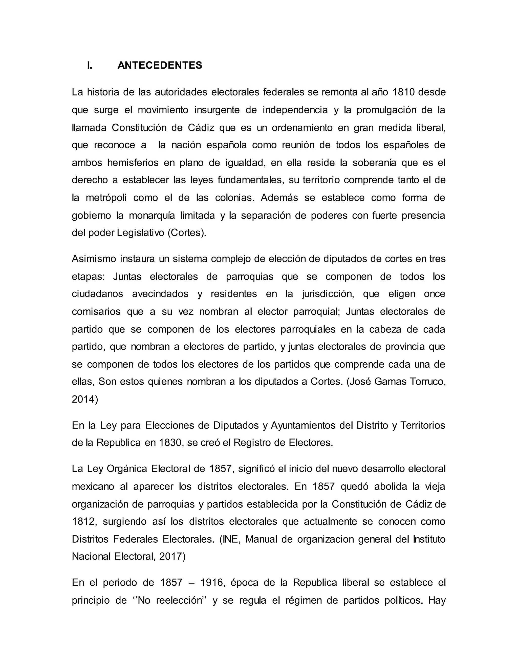 El documento describe la evolución histórica de las autoridades electorales en México desde 1810 hasta la actualidad. Se establecieron diversas instituciones como la Junta Empadronadora en 1917 y la Comisión Federal Electoral en 1973 para organizar las elecciones. En 1990 se creó el Instituto Federal Electoral para garantizar procesos electorales justos, transparentes y legales. Finalmente, en 2014 se transformó en el Instituto Nacional Electoral para fortalecer la democracia en México.