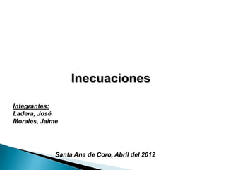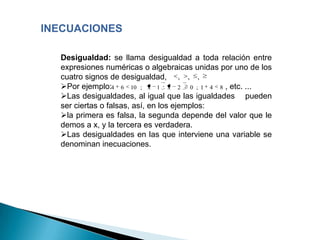 Este documento trata sobre inecuaciones. Explica que una inecuación es una desigualdad que contiene una o más variables. Detalla los principios de equivalencia para transformar inecuaciones, como sumar o restar términos iguales o multiplicar por una cantidad positiva. También cubre cómo resolver inecuaciones de primer grado aplicando estos principios para aislar la variable.