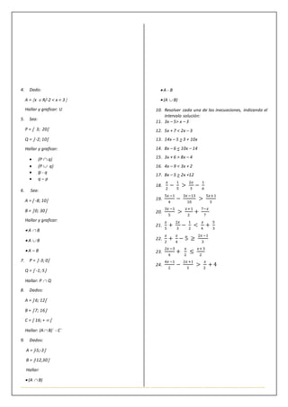 1. El documento presenta diferentes tipos de inecuaciones y ejercicios para resolverlas. Incluye inecuaciones lineales, cuadráticas, racionales y sistemas de inecuaciones, así como preguntas sobre intervalos de números reales.