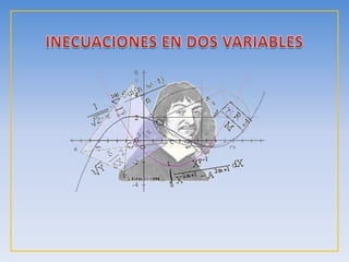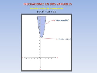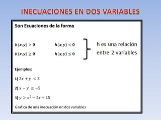 Este documento define una inecuación lineal con dos variables como una expresión de la forma ax + by ≤ c, donde a, b y c son números reales y x e y son las incógnitas. Explica que la recta definida por la inecuación divide el plano en dos regiones, una de las cuales es la solución. Para determinar cuál es la región solución, se toma un punto cualquiera y se comprueba si cumple o no la inecuación original. Si es cierta para ese punto, entonces la región que lo contiene es la soluc