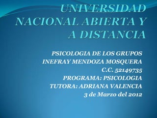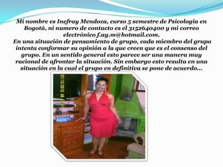 El documento presenta una introducción a la psicología de los grupos. Explica que un grupo se define como dos o más individuos que se relacionan e interactúan para alcanzar objetivos comunes. También describe algunos tipos de grupos y las influencias que los grupos ejercen sobre sus miembros, como la presión para conformarse a las normas del grupo. Finalmente, proporciona algunas referencias bibliográficas sobre este tema.