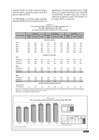 Este informe técnico presenta datos sobre las condiciones de vida en el Perú entre enero y marzo de 2010. Reporta tasas de asistencia escolar a nivel nacional, urbano y rural para diferentes grupos de edad, incluyendo educación inicial, primaria y secundaria. A nivel nacional, la tasa de asistencia escolar para personas de 3 a 16 años fue de 87.8%, mientras que la tasa de asistencia a educación inicial para niños de 3 a 5 años fue de 61.3%. El informe también incluye cuadros y gráf