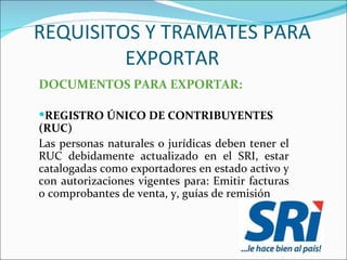 Este documento proporciona información sobre los requisitos y trámites para exportar en Ecuador. Detalla los documentos necesarios como el RUC, conocimiento de embarque, factura proforma, certificados, factura comercial. También cubre trámites específicos para exportar productos del mar y los posibles regímenes aduaneros y productos exportables.