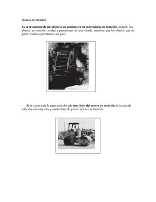 1) El documento habla sobre la inercia rotacional y cómo depende de cómo se distribuye la masa de un objeto. 2) Explica que cuanto más lejos esté la masa del centro de rotación, mayor será la inercia rotacional. 3) También introduce conceptos como el momento de inercia, momento angular, torque y conservación del momento angular. Incluye ejemplos y ejercicios resueltos para ilustrar estos conceptos.