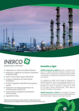 Inerco Inspección y Control se especializa en la calidad ambiental, la prevención de accidentes graves y la inspección de instalaciones de protección contra incendios en la industria. La compañía cuenta con acreditaciones por ENAC que avalan su calidad en inspecciones y ensayos. Además, está autorizada a actuar como entidad colaboradora de la administración en varias comunidades autónomas.