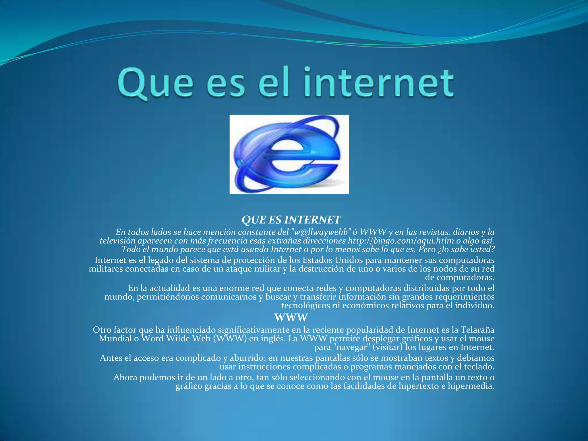 Internet es una red mundial que conecta computadoras y permite compartir información. Fue creada originalmente por el gobierno de Estados Unidos para conectar sus computadoras militares. La World Wide Web (WWW) ha hecho que Internet sea más accesible al público general al permitir navegar entre sitios web de forma gráfica usando enlaces hipertextuales. Las computadoras personales también han contribuido a la popularización de Internet al hacerla más asequible para individuos.