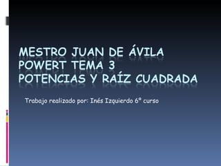Este documento explica conceptos básicos sobre potencias y raíces cuadradas. Define una potencia como una forma abreviada de expresar una multiplicación de factores iguales, donde la base es el factor que se repite y el exponente indica cuántas veces se multiplica la base. Explica los casos especiales de cuadrados y cubos, y cómo usar potencias de base 10 para expresar números grandes de forma abreviada. También describe cómo calcular raíces cuadradas y proporciona enlaces a juegos y videos adicionales sobre estos temas.