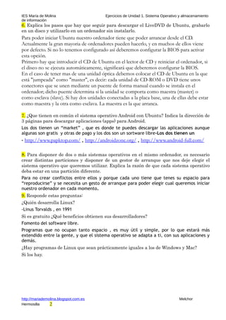 Este documento presenta ejercicios sobre sistemas operativos y almacenamiento de información. Incluye preguntas sobre sistemas operativos comunes como Windows y Linux, así como sobre formatos de archivos, dispositivos de almacenamiento y características de discos duros. También propone prácticas como crear carpetas usando la línea de comandos, instalar y desinstalar aplicaciones, e investigar la capacidad y especificaciones del disco duro del estudiante.