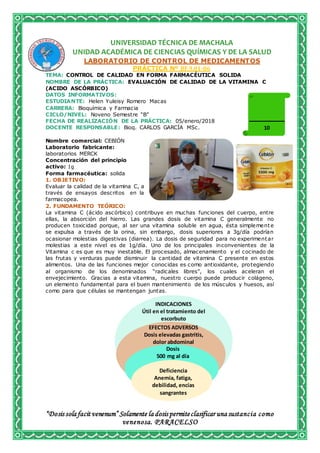 Este documento describe los procedimientos realizados en un laboratorio para evaluar la calidad de la vitamina C a través de diferentes ensayos. Se detallan métodos para determinar el ácido ascórbico en una tableta de vitamina C y en pimientos utilizando titulación de yodato de potasio, voltamperometría y espectrofotometría. El objetivo es medir la cantidad de vitamina C presente y verificar que cumple con los estándares de calidad requeridos.