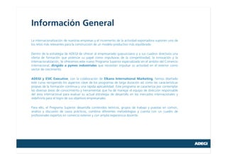 El programa superior en dirección de negocios internacionales, ofrecido por ADEGI y ESIC Executive, está diseñado para apoyar a pymes industriales en su internacionalización, potenciando su competitividad e innovaciones. Con una duración de 120 horas, el curso incluye diversas metodologías de enseñanza y aborda áreas clave como marketing internacional, estrategias de expansión y gestión de la cadena de suministro. Está dirigido a empresarios y directivos, y se enfoca en proporcionar herramientas prácticas para optimizar operaciones internacionales y analizar estrategias de mercado.
