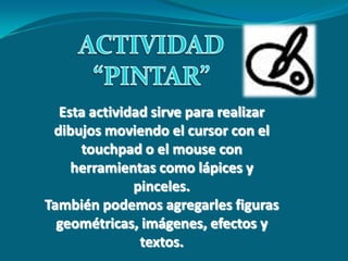 Este documento describe una herramienta de dibujo en la que los usuarios pueden crear arte usando lápices, pinceles y otras herramientas. Incluye opciones para agregar figuras geométricas, imágenes y texto. Las herramientas y opciones se encuentran fácilmente en el menú superior y permiten que usuarios de todas las edades se diviertan aprendiendo a pintar.