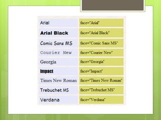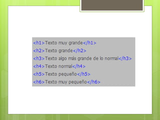 El documento explora la manipulación de texto en HTML, incluyendo el uso de las etiquetas <font>, <h>, <img> y <marquee> para ajustar tamaño, tipo, color y presentación del texto. Se mencionan las propiedades y atributos asociados a estas etiquetas, subrayando la importancia de la accesibilidad a través del atributo 'alt' en imágenes. Además, se discuten prácticas recomendadas para evitar problemas de visualización por la falta de ciertos tipos de letra en diferentes plataformas.