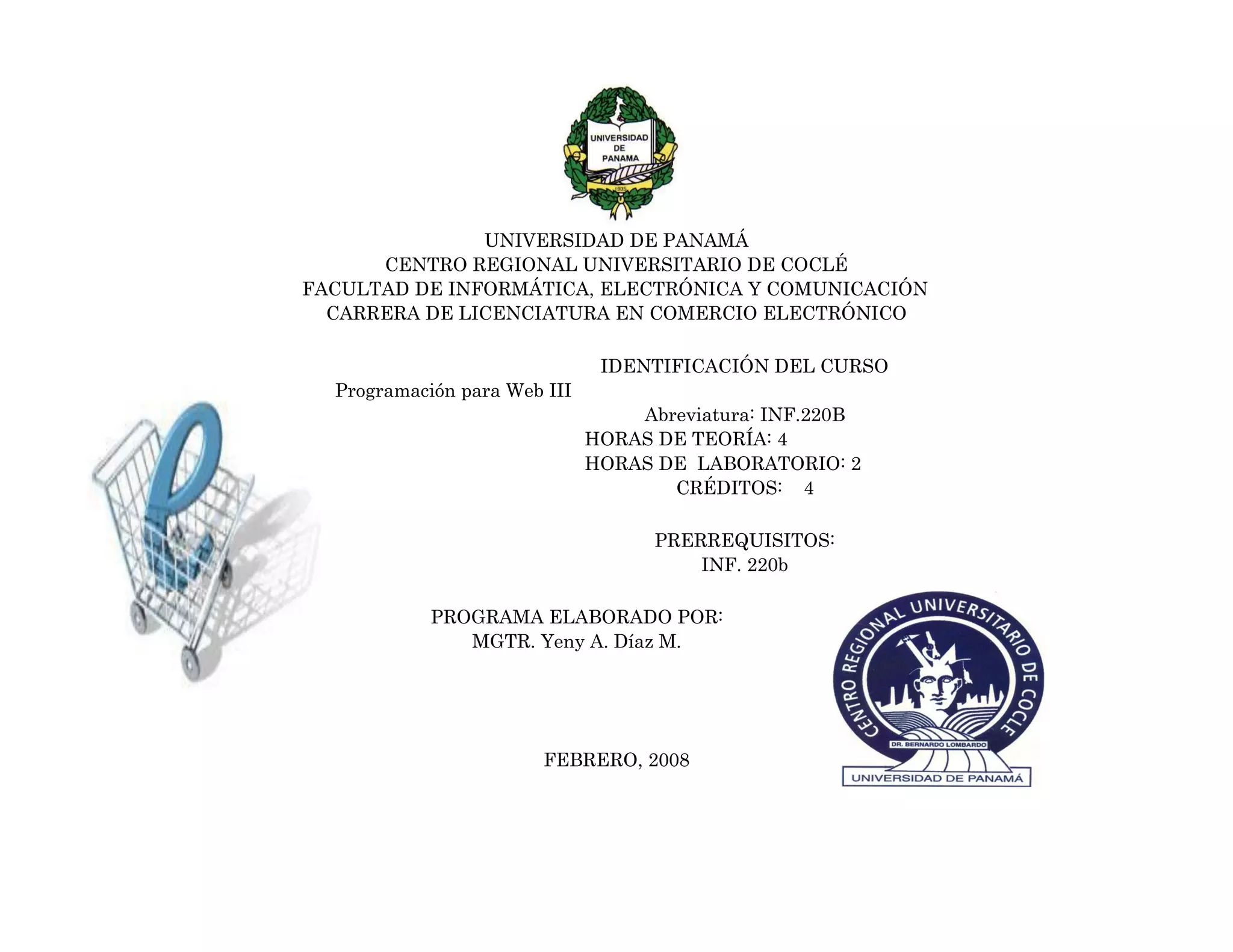 Este documento describe un curso de Programación para Web III en el Centro Regional Universitario de Coclé de la Universidad de Panamá. El curso se enfoca en el lenguaje de programación JSP SERVER y consta de cinco unidades que cubren los fundamentos, estructura básica y operaciones del lenguaje. Los objetivos del curso son que los estudiantes conozcan y aprendan a programar en JSP SERVER para crear aplicaciones web.