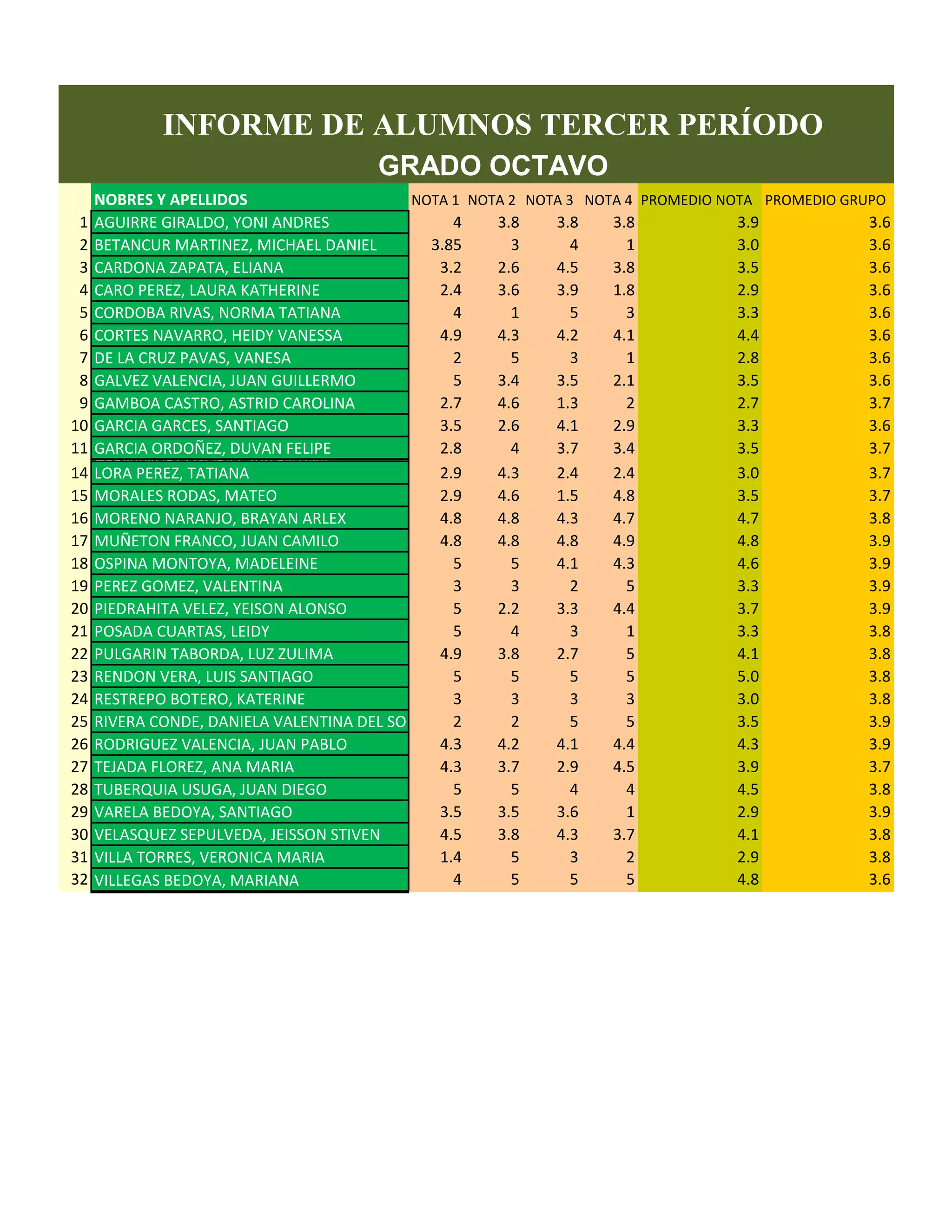 El informe presenta los resultados académicos del tercer periodo de 32 estudiantes de octavo grado. Incluye sus nombres, las notas de cada uno de los cuatro periodos evaluados, el promedio de notas y el promedio general del grado. La mayoría de estudiantes obtuvieron un promedio entre 2.9 y 4.1, con algunos destacándose por encima de 4.5.