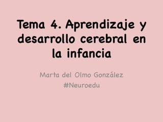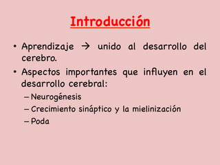 El documento describe el desarrollo cerebral en la infancia y su relación con el aprendizaje. Explica que existen periodos sensibles en los primeros años donde ciertos aprendizajes son más fáciles de adquirir. También señala la importancia de un entorno estimulante y de experiencias multisensoriales repetidas para fortalecer las conexiones neuronales y promover el aprendizaje en la infancia.