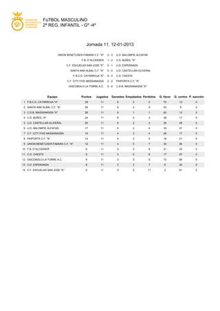 Este documento presenta los resultados de la 11a jornada de la 2a regional infantil masculina de fútbol en la categoría sub-12. Los equipos F.B.C.D. Catarroja "A", Santa Ana Albal C.F. "A" y C.D.B. Massanassa "A" ocupan los primeros puestos en la tabla de posiciones.