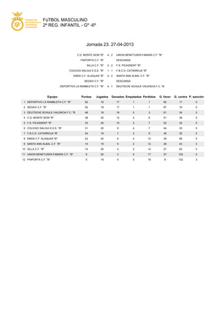 Este documento resume los resultados de la Jornada 23 de la 2a Región Infantil - Go-6o. El C.D. Monte Sión "B" venció 4-2 al Union Benetuser-Fabara C.F. "B", mientras que el Silla C.F. "B" y el F.S. Picassent "B" empataron 2-2. El Deportivo La Rambleta C.F. "B" derrotó 4-1 al Deutsche Schule Valencia F.C. "B" y lidera la tabla con 52 puntos.