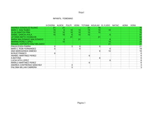 Este documento presenta los resultados de competiciones deportivas femeninas infantiles en varios municipios. Se muestra el nombre de cada participante y los puntos obtenidos en cada competición, con un total acumulado al final. Andrea González Ruano obtuvo el mayor puntaje total con 78 puntos.