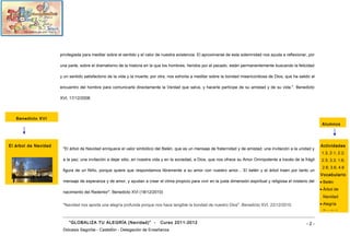 El documento resume las enseñanzas del Papa Benedicto XVI sobre el significado y los símbolos de la Navidad. El Papa explica que la Navidad conmemora la encarnación de Dios como hombre en Jesús y su nacimiento en Belén. También habla sobre el pesebre, el árbol de Navidad, la Virgen María y la necesidad de hacer sitio para Dios en nuestras vidas. El Papa enfatiza que la Navidad trae un mensaje de esperanza, amor y alegría.