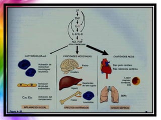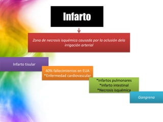 Este documento describe el infarto y el shock séptico. Explica que el infarto es una zona de necrosis isquémica causada por la oclusión arterial, y que puede ocurrir en diferentes órganos como el corazón, los pulmones e intestino. Describe los factores que determinan el desarrollo de un infarto, como la naturaleza del aporte vascular y la velocidad de desarrollo de la oclusión. También explica que el shock séptico se caracteriza por una hipotensión sistémica debido a una disminuc