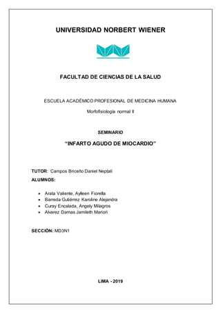 1) El documento describe el seminario sobre infarto agudo de miocardio realizado por estudiantes de medicina, incluyendo las causas, síntomas, diagnóstico y tratamiento del infarto. 2) Entre los síntomas descritos se encuentra un dolor opresivo en el pecho que puede irradiarse a brazos, cuello y espalda, dificultad para respirar, sudoración y palidez. 3) El tratamiento incluye oxigenoterapia, nitratos, analgesia, antiagregantes plaquetarios, anticoagulantes,