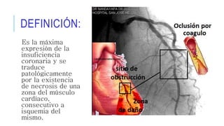 El documento describe el infarto del miocardio, definiéndolo como la necrosis de una zona del músculo cardíaco debido a la isquemia. Explica que puede ser subendocárdico o transmural dependiendo de qué parte del espesor de la pared ventricular se ve afectada, y que la gravedad y pronóstico varían según el tipo y extensión del infarto. También describe los cambios fisiopatológicos, clínicos, ecográficos y de función ventricular que ocurren durante un infarto del miocardio agudo