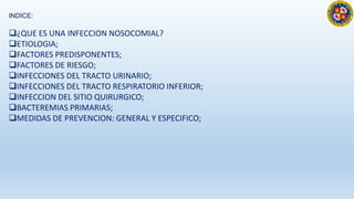 Este documento describe las infecciones nosocomiales, las cuales son infecciones adquiridas en hospitales u otros centros de atención médica. Define las infecciones nosocomiales, sus causas más comunes, factores de riesgo y las principales medidas de prevención. Las infecciones nosocomiales más frecuentes son las infecciones del tracto urinario, las infecciones del tracto respiratorio inferior y las infecciones de heridas quirúrgicas. Las medidas de prevención clave incluyen el lavado de manos, el uso