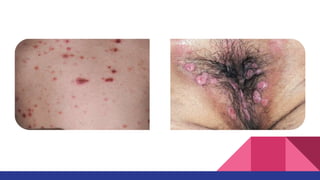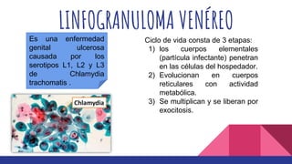 El documento aborda varias infecciones de transmisión sexual (ITS), incluyendo el linfogranuloma venéreo, chancroide, gonorrea, clamidia, herpes genital, tricomoniasis, candidiasis, molusco contagioso y sífilis, detallando su etiología, síntomas, diagnóstico y tratamiento. Se menciona que estas infecciones son comunes entre ciertos grupos de población, especialmente jóvenes y personas con múltiples parejas sexuales. Además, se discuten aspectos como la morbilidad, complicaciones potenciales y la importancia de la identificación y tratamiento oportuno.