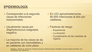 Este documento trata sobre las infecciones relacionadas a dispositivos intravasculares. En primer lugar, describe la epidemiología de estas infecciones, incluyendo sus principales causas, factores de riesgo y tasas de incidencia. Luego, define los diferentes tipos de catéteres intravasculares y sus usos. Por último, aborda aspectos relacionados con la etiología, diagnóstico, tratamiento y prevención de estas infecciones.