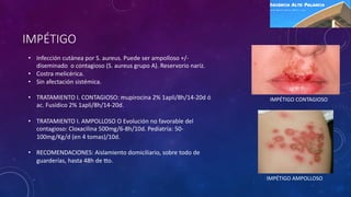 Este documento resume varias infecciones bacterianas de la piel como el impétigo, foliculitis, forúnculos, celulitis, erisipela, linfangitis, paroniquia, herpes simple y zoster. Proporciona detalles sobre su etiología, síntomas, tratamiento y recomendaciones para cada una. También cubre zoonosis como sarna y pediculosis, incluyendo sus características y tratamiento tópico con permetrina.