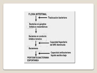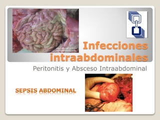 Este documento describe la anatomía y fisiología de la cavidad peritoneal y las infecciones intraabdominales como la peritonitis y el absceso intraabdominal. Explica que el peritoneo es una membrana que reviste la cavidad abdominal y cubre los órganos. Las infecciones intraabdominales incluyen la peritonitis primaria, secundaria y terciaria, y pueden ocurrir cuando se rompe la barrera anatómica normal del abdomen. La peritonitis es la inflamación de la superficie peritoneal y causa varias