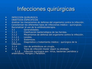 El documento describe diferentes tipos de infecciones quirúrgicas. Explica la clasificación bacteriológica de heridas quirúrgicas, los mecanismos de defensa del organismo contra la infección, y los tipos comunes de gérmenes patógenos que causan infecciones como bacterias, hongos y parásitos. También analiza el diagnóstico, tratamiento y prevención de infecciones quirúrgicas.
