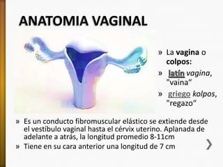 Este documento describe la anatomía y flora bacteriana normal de la vagina, así como las principales causas de infecciones vaginales como la vaginosis bacteriana, la candidiasis y la tricomoniasis. Explica los síntomas, diagnóstico y tratamientos recomendados para cada una de estas infecciones.