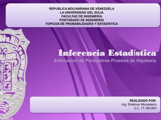 Este documento presenta conceptos básicos sobre inferencia estadística, incluyendo estimación de parámetros, comparación de estimadores, criterios para estimados, propiedades de estimadores como estimadores de máxima verosimilitud, y métodos de estimación como intervalos de confianza. El objetivo es introducir estas técnicas estadísticas y sus definiciones matemáticas para su aplicación en problemas de estimación e hipótesis.