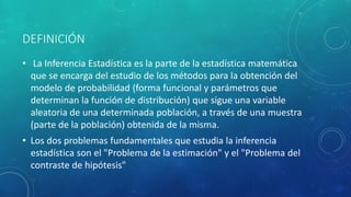 Este documento define la inferencia estadística y describe sus métodos fundamentales como la estimación, el contraste de hipótesis y los intervalos de confianza. Explica los tipos de muestreo probabilísticos y no probabilísticos, y los pasos para probar hipótesis estadísticas utilizando estadísticos como z, t de Student y Ji cuadrado.