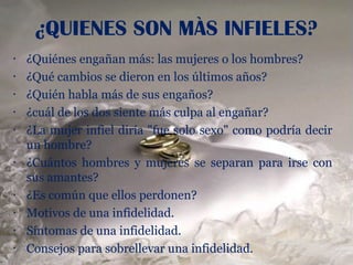 Este documento discute la infidelidad entre hombres y mujeres. Aunque los hombres son más infieles, la brecha se está reduciendo. Las mujeres ahora se sienten más cómodas hablando sobre sus engaños. Las mujeres sienten más culpa por la infidelidad, pero la sobrellevan. El documento también analiza los motivos y síntomas comunes de la infidelidad, así como consejos para lidiar con una infidelidad.