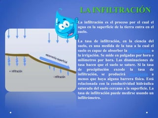 Este documento trata sobre el proceso de infiltración del agua en el suelo. Explica que la infiltración ocurre cuando el agua de la superficie entra en el suelo, y que la tasa de infiltración depende de factores como la porosidad y humedad del suelo. También describe cómo medir la tasa de infiltración usando un infiltrómetro, y cómo la capacidad de infiltración del suelo afecta la escorrentía superficial. Además, presenta la ecuación de Horton para estimar la capacidad de in