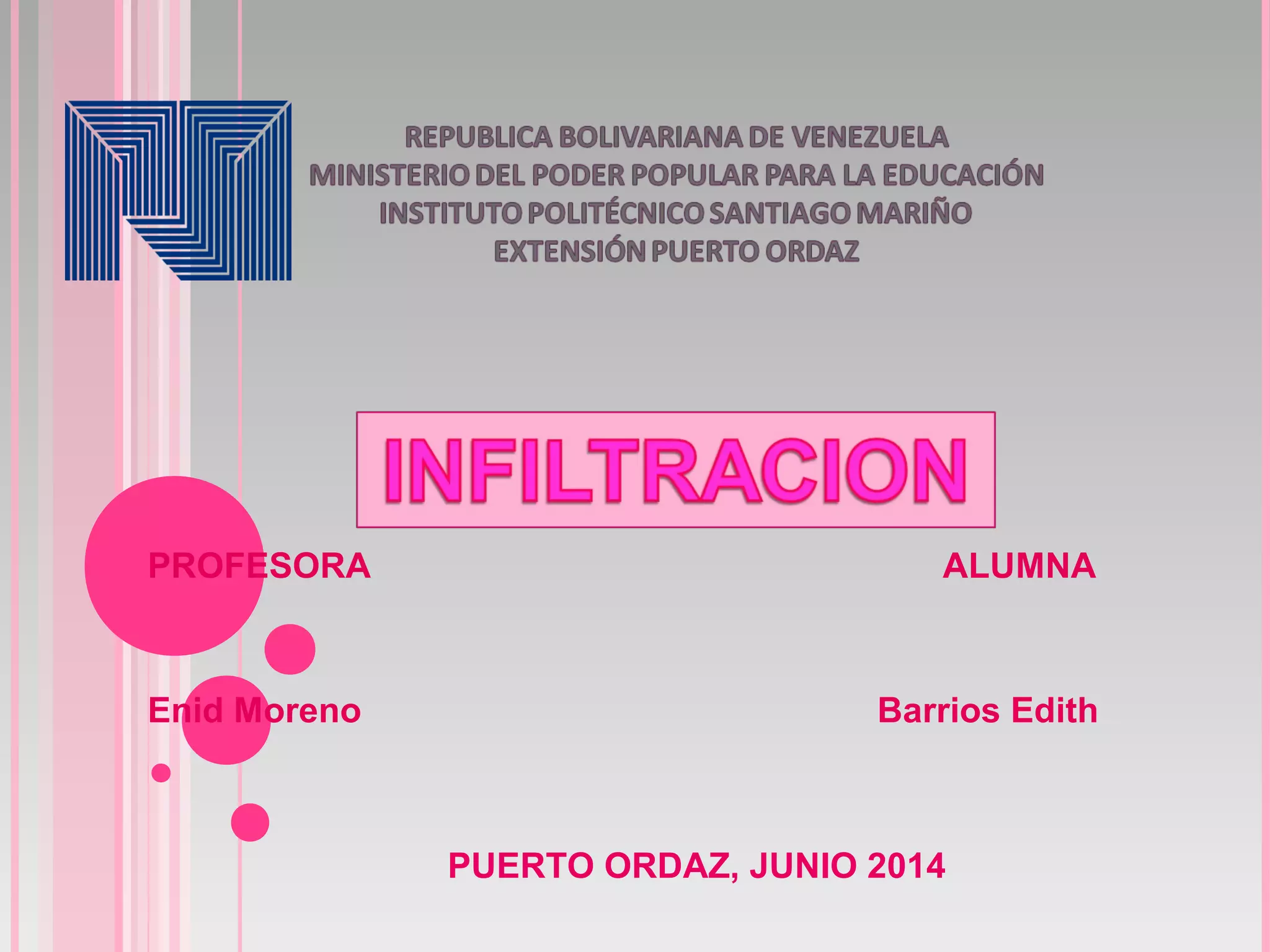 Este documento describe el proceso de infiltración del agua en el suelo. Define la infiltración como el proceso por el cual el agua penetra desde la superficie del terreno hacia el suelo. Explica que la infiltración satisface inicialmente la humedad del suelo cercano a la superficie y luego pasa a formar parte del agua subterránea. También describe métodos para medir la infiltración como los infiltrómetros y conceptos como la curva de capacidad de infiltración.