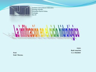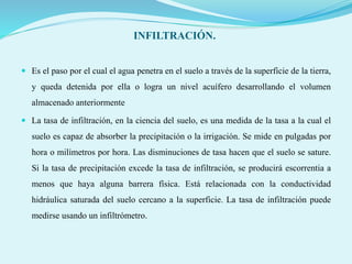 El documento describe los procesos de infiltración, capacidad de infiltración y métodos para medir la tasa de infiltración como infiltrómetros. Explica que la infiltración es el paso del agua a través del suelo y depende de la porosidad y capacidad del suelo para absorber agua. También presenta métodos para determinar la curva de capacidad de infiltración media como el modelo de Horton.