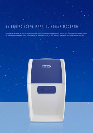El documento describe un equipo de ósmosis inversa para uso doméstico llamado Infinity. Infinity produce agua purificada a través de ósmosis inversa utilizando la mejor tecnología, diseño y materiales. También viene equipado con grifos Metalfree que evitan la migración de metales pesados al agua y proporcionan agua pura.